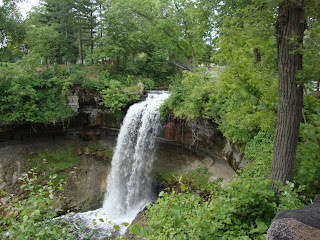 Tuesday morning I had an agenda, and while it was cloudy, the rains had finally quit, so off we ran to the Mall of America for books (for Rei and Kimmie) and Cinnabon's for breakfast. Then we ran to the cemetary so I could "have coffee with my dad" (I even poured out some next to his headstone so we could "share" it), followed by a stop at Minnehaha Falls, so I could get a few pictures. We dropped Liisa off at her house and said our goodbyes, then ran over to Andrea's to say goodbye there. The little ones didn't want us to go, but knowing we had a long ride ahead of us, we knew we couldn't stay too terribly long. After a story, some hugs, and kisses, (as well as high fives and fist bangs), we got into the van and headed off for IL. We actually got on the road at 11 a.m., an hour earlier than my "deadline time" to be on the road of Noon.